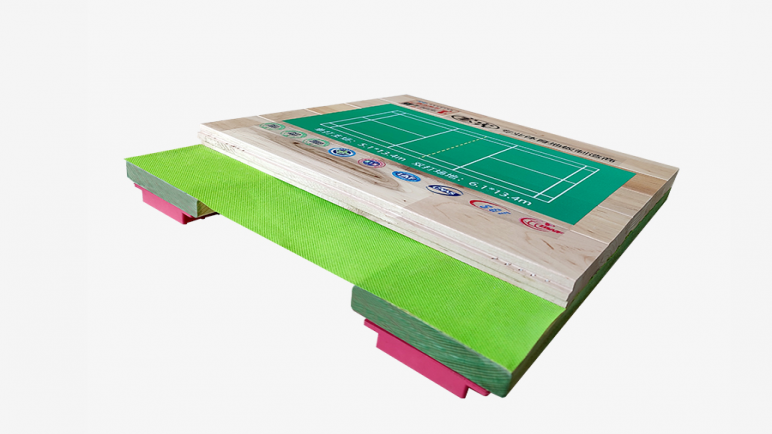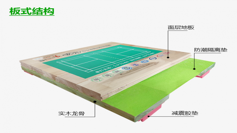 懸浮式單層板式結構是一種具有高舒適性性、環保經濟的一款運動木地板系統。采用板式龍骨層架空,適用于羽毛球場地,健身房,乒乓球場地。特別是場地標高不夠的運動場所。整體運動木地板高度5厘米。