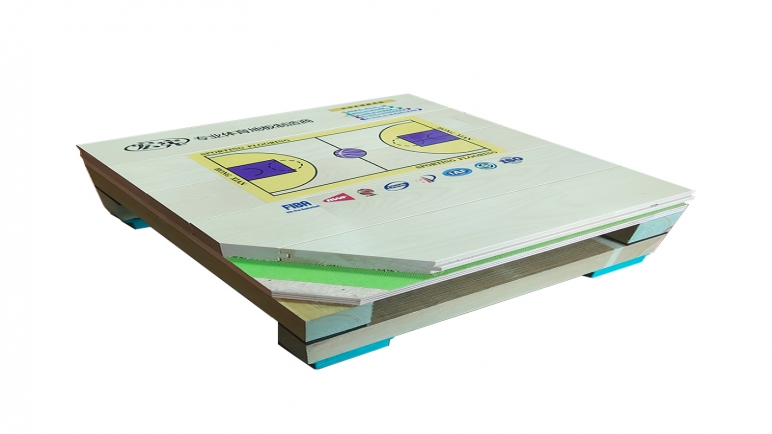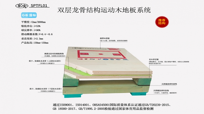 雙層板上下龍骨雙彈結(jié)構(gòu)高吸震性和連續(xù)回彈性的固定懸浮式的運動木地板系統(tǒng),適用于國內(nèi),國際比賽。