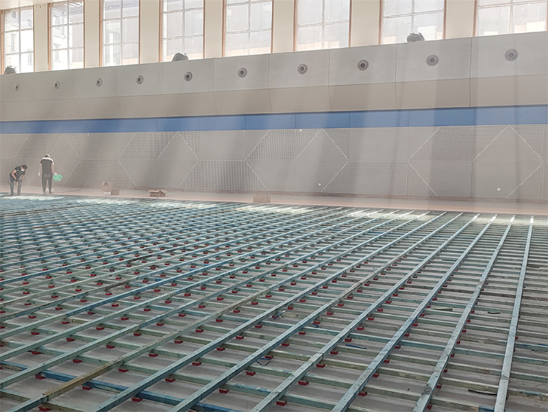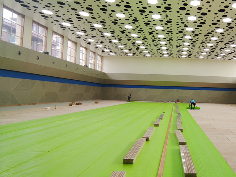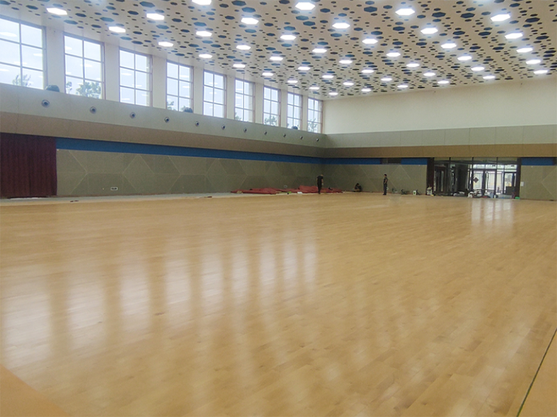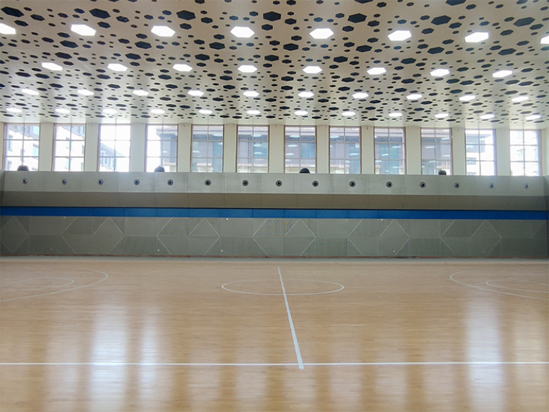 場館共700平米,采用宏憲SPTFL05運動木地板系統,整體結構穩定性強;擁有更好的沖擊吸收率和通風性能;20mm厚窩蜂形紅色天然橡膠減震墊,相對于其他膠墊厚度較高,減震緩沖性能更好。面板進行加黃調色處理,顏色偏深更貼近比賽場館,視覺效果更佳。外觀上采用星空形的吸音房頂加黃的較高等級的面板再加上場館左右窗戶灑下的陽光更突出球館的夢幻和高端。