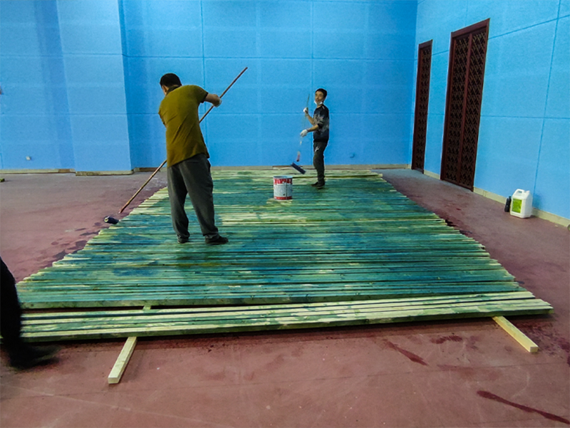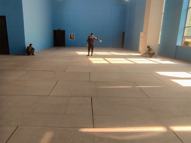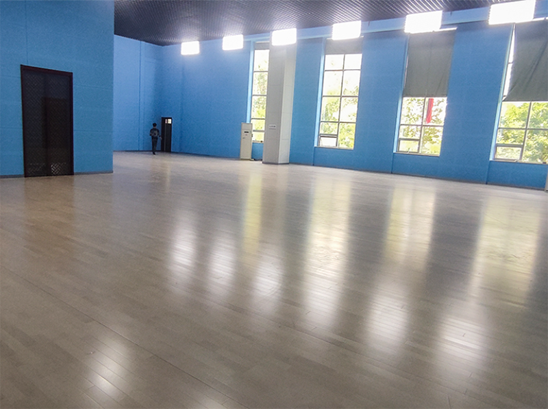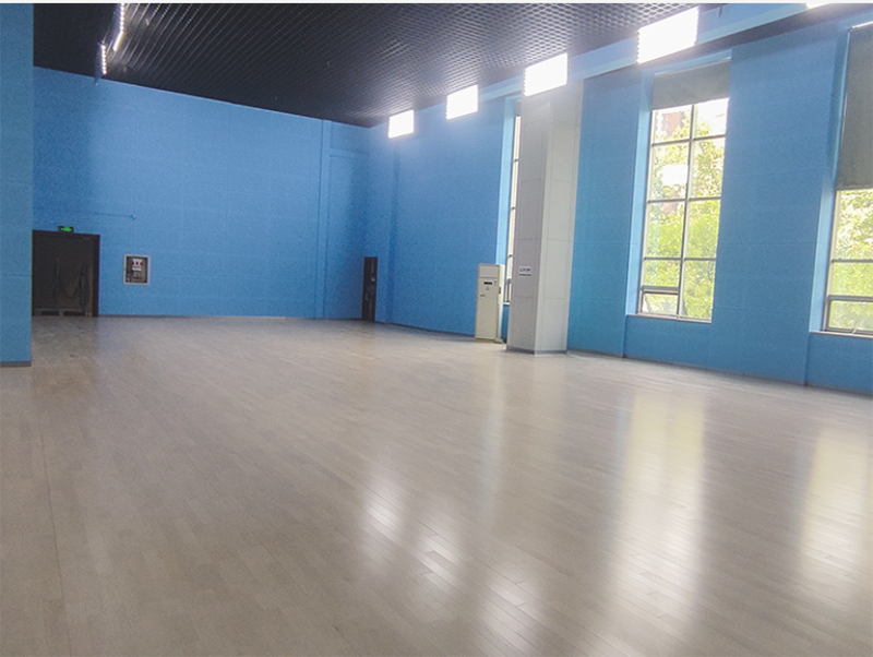 共歷時4天,場館底層采用單龍骨結構,使用烘干防腐松木龍骨保證場館不易潮濕、生蟲蟻,面層采用楓樺木A級面板,屬于運動木地板中面板外觀等級較高的,面板紋理清晰,整潔無瑕;場館右側墻體雖然是半弧形狀,不易鋪地板,但施工師傅結合過往的經驗和專業的技術完成了鋪設,把控細節,精益求精。整體地板搭配藍色墻面背景使場館更加簡約大氣。