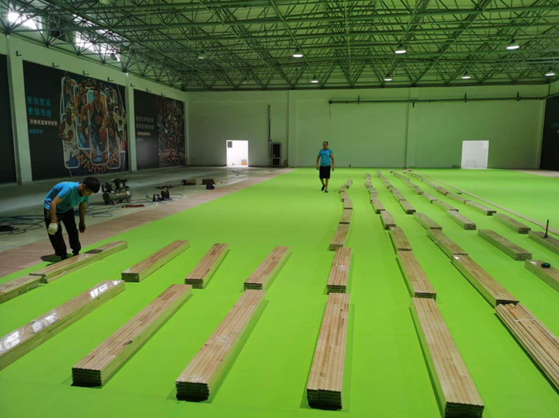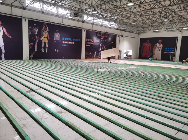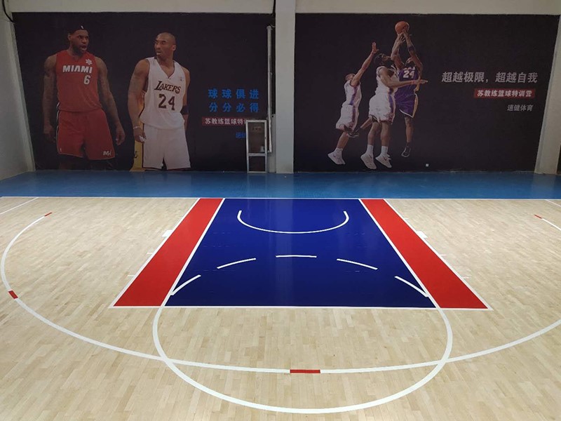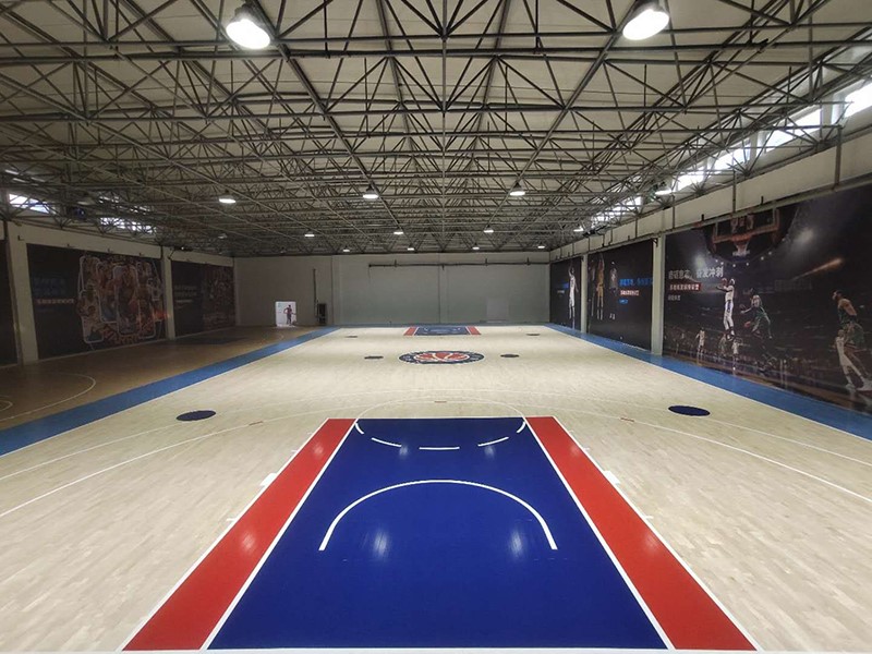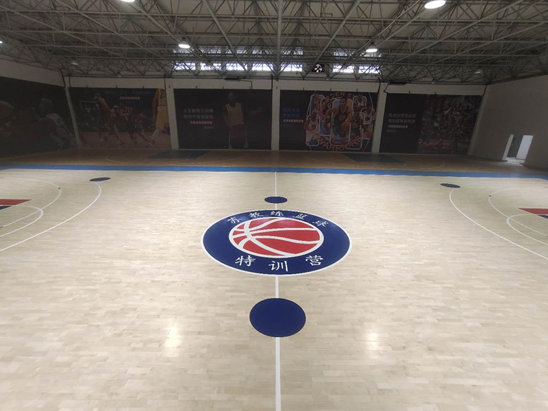 山東速健籃球館木地板整體面積970平米,分為主場區與訓練區。采用楓樺木A級地板,單層龍骨結構。現場澆筑彩色氛圍油漆。順利完工驗收,得到客戶的一致好評。