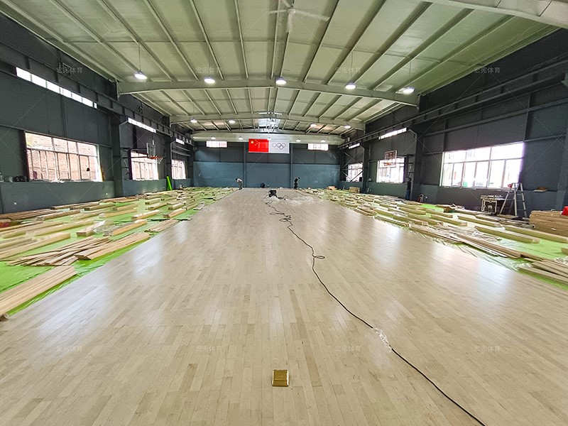 山西800平米新動力籃球館完工,該場館為一個標準的個人廠房改造,不僅要注重打球的效果,還要在此基礎上最大程度的節約成本,采用主廠區為楓樺木A級面板,邊上緩沖區為楓樺木C級面板的方案,底層使用宏憲專利膠墊,達到E1級環保,抗壓耐用。